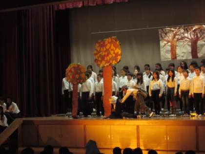 6年生の発表は,『おかあさんの木』でした。最高学年のしっかりとした発表態度がつくる「張りつめた真剣な空気」に,低学年の子どもたちも最初から引き込まれているようでした。演技も歌も演奏も,「さすが6年生!」というレベルでした。『一生懸命な,かっこいい6年生』の姿に,あこがれの気持ちをもった下級生も多かったのではないでしょうか。