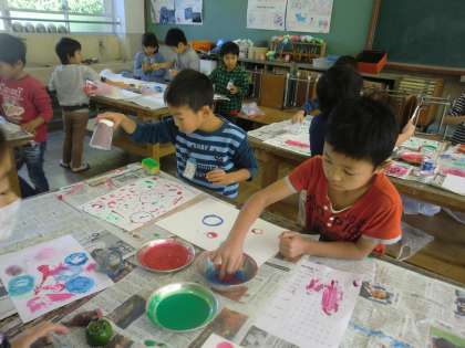 ゼリーのカップや,せんたくばさみや,ネット,スポンジやプチプチ(梱包材),古い歯ブラシ,野菜のへたなどいろいろなものに絵の具をつけて,ぺったんと押してみて,どんな形になるか楽しみました。
