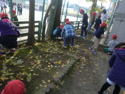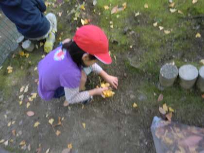 二か所目は,校庭のイチョウの木の落ち葉です。拾うそばから,風に吹かれてはらはらと葉っぱがおちてきました。