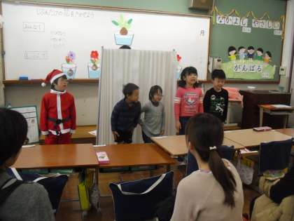一人ひとりの花が咲いた後,5組の花をみんなで咲かせようと,「へんしんプレゼント」の劇をしました。その劇を見たお家の方は,また,たくさんの花を咲かせていただき,満開。