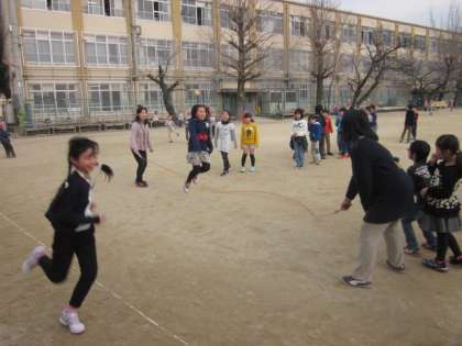 中間休みになると,たくさんの子が運動場に出て楽しく遊んでいました。冬休み中は広い場所で遊べなかったかもしれません。友だちといっしょに力いっぱい遊ぶ様子はとてもほほえましかったです。