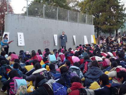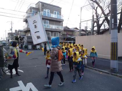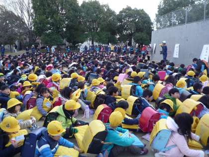 今日は,今年度最後の避難訓練を行いました。地震,火災を想定し,一次避難(教室),二次避難(運動場),三次避難(牛ケ瀬公園)そして,最後は保護者への引渡しという流れで行いました。