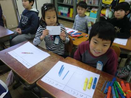 数字を見て,数え棒を並べたり,数え棒を見て数字を書いたりしています。