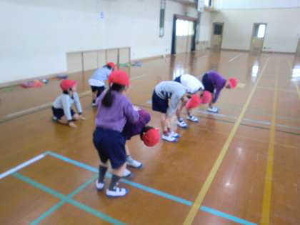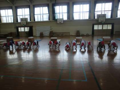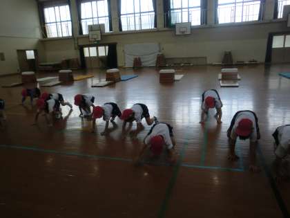 体育でがんばっているとびばこあそびですが,準備運動としてうまとび,うさぎとび,かえるとびなどの運動をしています。