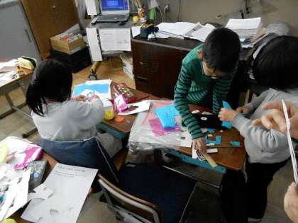 紙を中心に,色々な材料で体や顔を作っていきました。