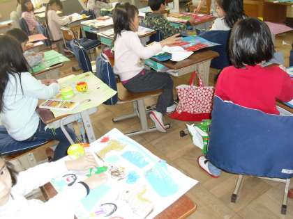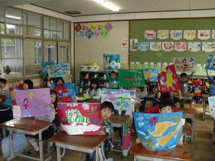 「やぶいたかたちから うまれたよ」の作品が仕上がりました。子どもたちの想像力はすばらしいですね。やぶいた形がいろいろなものに見えてきました。