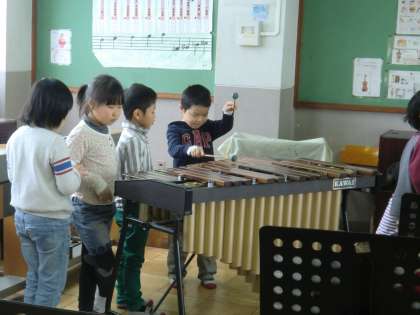 音楽室にいって,木琴や鉄琴で「きらきらぼし」を演奏しました。きれいな音がでる音の出し方を工夫しました。