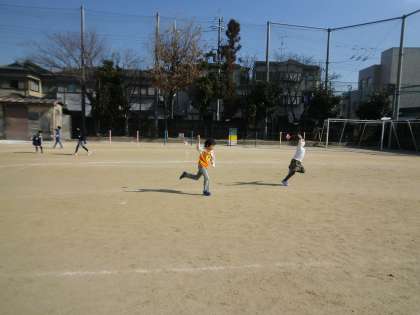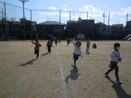 出来上がったばかりの手作りのおもちゃ「クルクルまわして」を持って,元気に風とあそぶ子どもたちです。