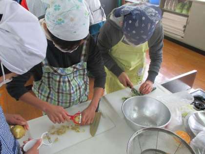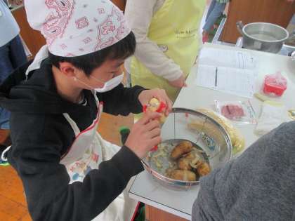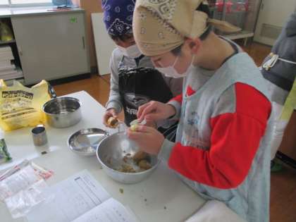 家庭科の授業で家族が喜ぶ献立を自分たちで作る授業をしました。自分たちで食材を持ちより一生懸命料理を作りました。