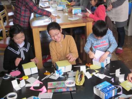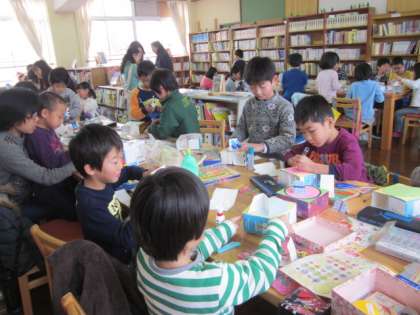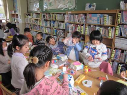 6日(土)午前中,今年度最後の土曜学習を行いました。今回も図書館ボランティア「クローバーの会」のお母さん方が『牛乳パックのトントン相撲』という楽しい企画を準備してくださいました。