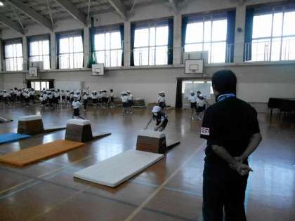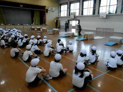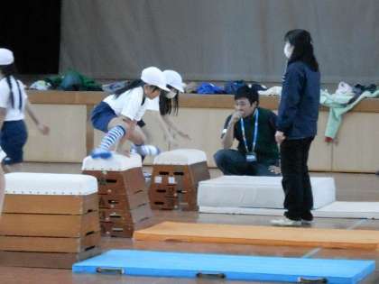 跳び箱では,手の安全なつき方や,踏み切りを両足そろえて跳ぶことなどに気をつけて練習しています。