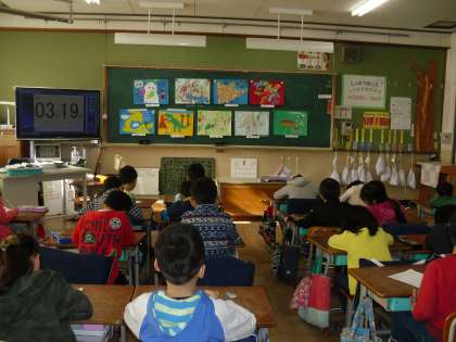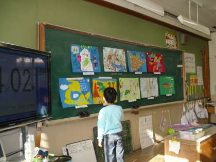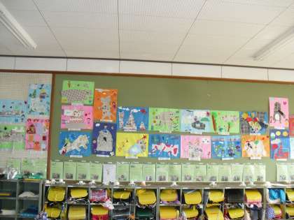図工の作品が,完成しました。お友だちの作品の良いところを見つけて発表しました。出来上がった絵を教室に飾ると,教室が明るくなりました。