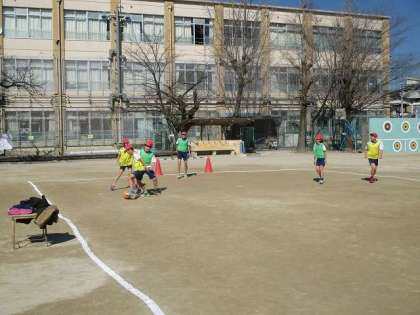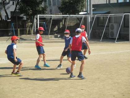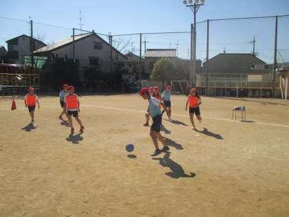 6年生の体育では,サッカーをしています。仲間で声をかけ合いながら楽しく授業ができました。