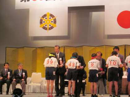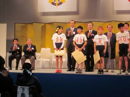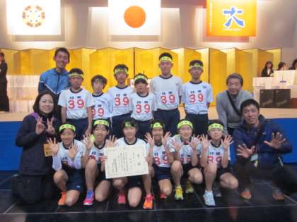 「大文字駅伝」大会の閉会式の様子です。壇上に上がって総合10位の賞状をいただきました。偶然にもプレゼンターは和田校長先生でした。