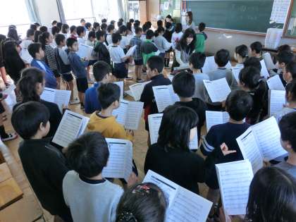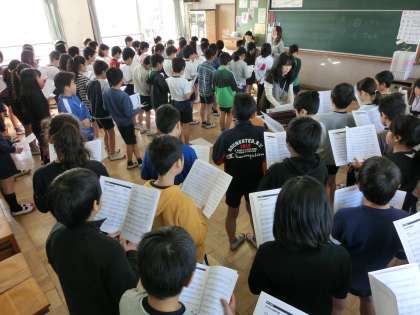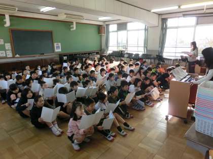 今回の曲は同声二部合唱なので,ソプラノパート,アルトパートに分かれて練習をしました。特にソプラノパートはかなり高い音程なので,子どもたちには難しかったようですが,今日1日の練習でずいぶん上手になりました。