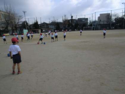 寒さに負けないで,ボールを追いかけて走っています。ボールに慣れるように,目標に向かってボールと走っています。