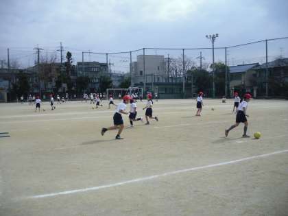 寒さも緩んできました。運動場を走るのがいい気持ちです。二人組でボールをパスしてゴールしたら1点入ります。何点入るかを競って楽しんでいました。