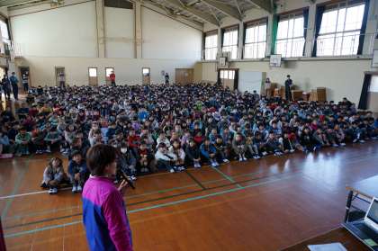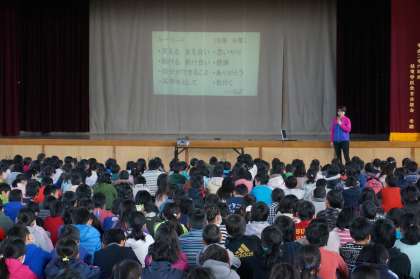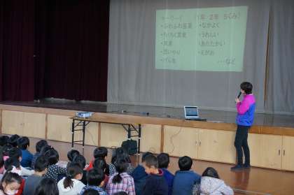 まず体育館で,下記のように今年度の全校道徳を振り返り,後半の教室での標語作りにつなげました。