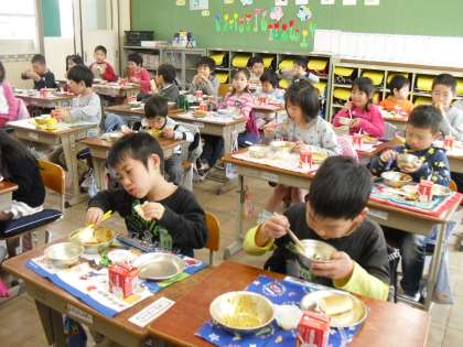 1年生にとっては小学校に入学して初めて食べる給食です。給食袋等,忘れ物のないように準備してください。