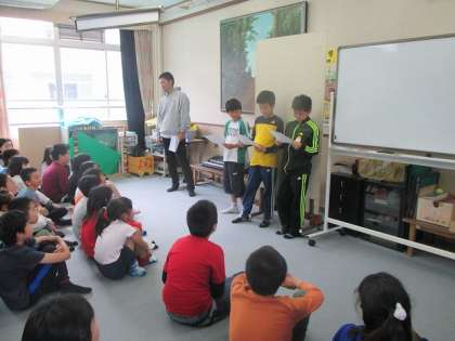 今日は,全国学力・学習状況調査がありました。その後,学年で集まり一年生をむかえる会に向けて学年集会をしました。寸劇の配役や言葉などが決まり,練習していきます。