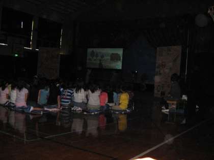 今年の観劇は,影絵による「ながぐつをはいたねこ」です。体育館の舞台全体に幕が張られ,入場してきた子どもたちはわくわくしながら開演を待ちます。
