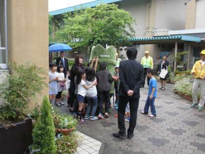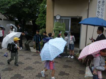 本日のあいさつ運動には,西京区のマスコットキャラクターの「たけにょん」がやってきてくれました。今年は西京区制40周年の年ということで,この桂東小学校のあいさつ運動にも一緒に参加してもらいました。子どもたちには,大人気でした。