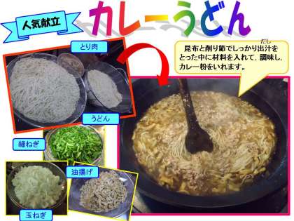 今日の給食は,鶏肉,油揚げ,玉ねぎ,細ねぎの入ったカレーうどんでした。