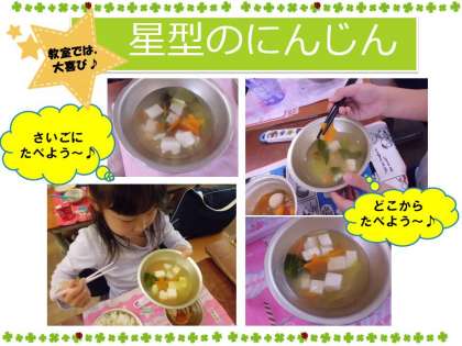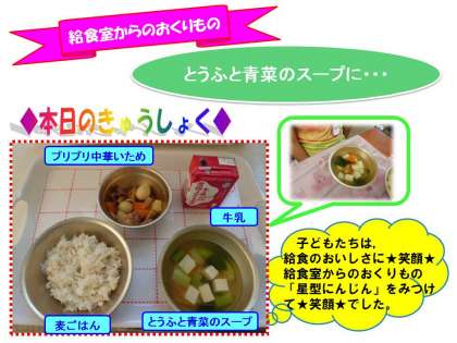 今日のこんだて「とうふと青菜のスープ」に給食調理員さんから,星型にんじんの素敵なおくりものが入っていました。