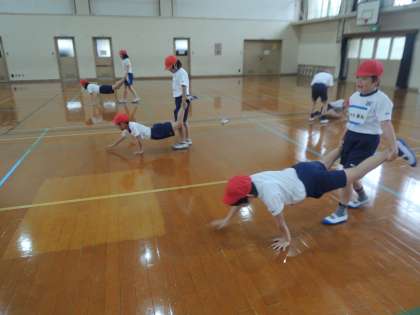 体ほぐしの運動では,他にもボールを使った運動やフラフープを使った運動,手押し車や馬とびなど様々な運動をしています。