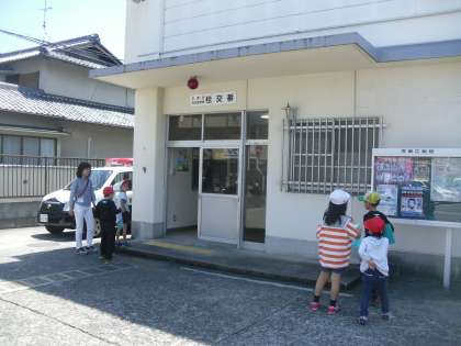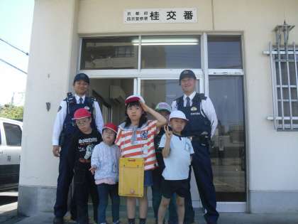 今日の学校のまわりの様子で交番へ行くと,交番の方々が優しく案内をしていただき,一緒に写真も撮っていただきました。それだけでなくいろいろな体験をさせていただき,子どもたちのテンションも上がり,先生たちのテンションも上がりました。