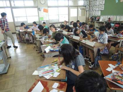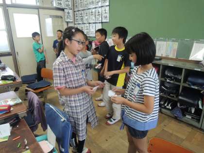 今日は,歌に合わせて「Hello, my name is 〜.Nice to meet you.」とあいさつの練習をしたり,名刺をつくって交換ゲームをしたりしました。