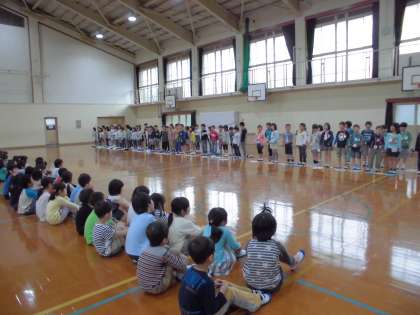 学校探検に行く前に学校を案内してくれる2年生のお兄さん,お姉さんと「よろしくの会」をしました。歌を歌ったり,貨物列車をしたり,とっても楽しい時間になりました。
