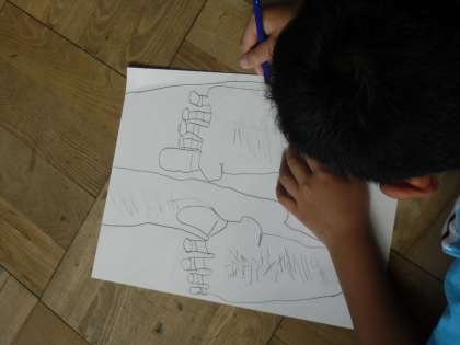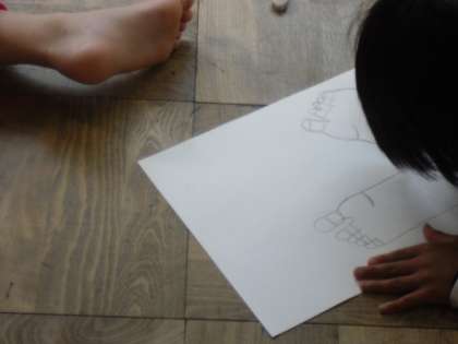 図工の時間に,自分の手や友達の足を見て画用紙に描きました。やわらかい線や見たままの形を鉛筆で描きます。本物よりも大きくなったり,小さくなったり難しかったです。