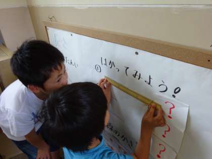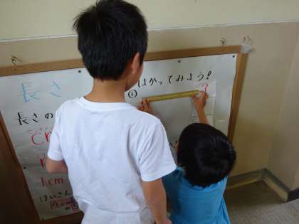算数コーナーの掲示板では,学習したことに,興味を持ち,ものさしを使って,長さを測っています。学習したことを生かして,お家でも色々な物を測ってみたいようです。