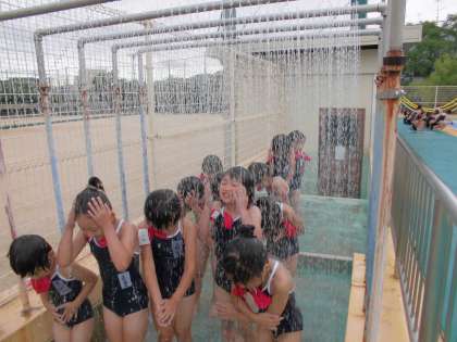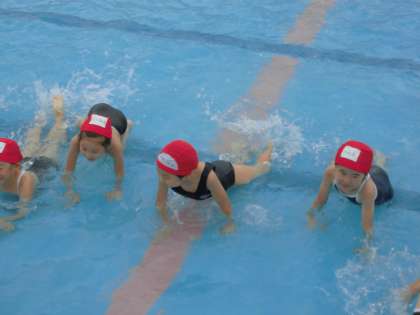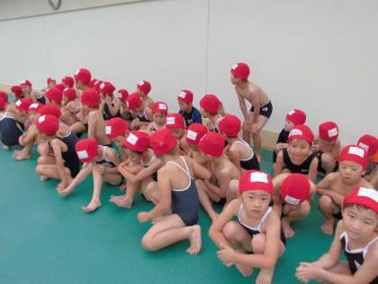 1年生にとって初めてのプールの授業をしました。プールの入り方、並び方の次に、みんなと一緒に水の中を歩いたり、ワニになって手をついて歩いたりしました。