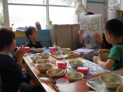 食後,明日の献立の「にしんなす」について,紙芝居をしていただき,「にしん」と
