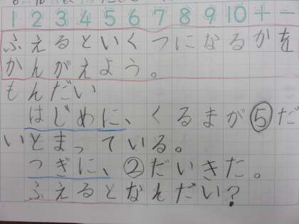 たしざんの学習が始まって数日たちます。今週は,「あわせていくつ」「ふえるといくつ」をしました。