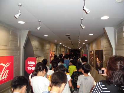 コカ・コーラ工場では,まず歴史を学ぶビデオやお話に出てきた昔のビンの容器を見ました。今のペットボトルや缶とは違う容器に子どもたちは,驚いていました。