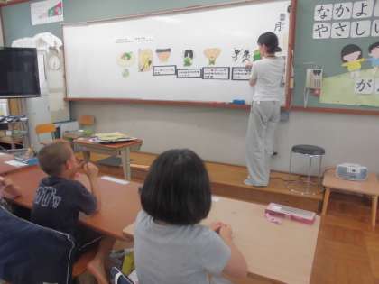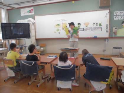学習が終わって,「ビタミンはバイ菌をやっつける」ことや,「せんいは,おなかのそうじをする」ことがわかったことを発表していました。