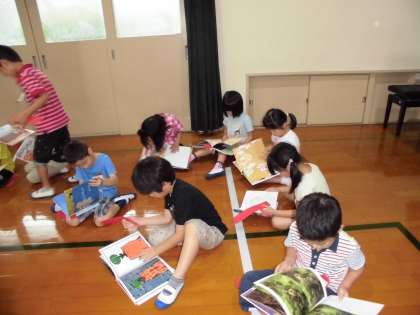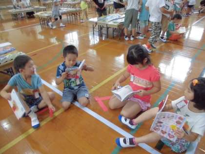 1時間目は、「選書会」でした。体育館に用意されたさまざまの本から、学校の図書館に揃えてほしい本を1冊選び、赤い画用紙のテープを挟みます。全校で行いますが、1年生は1時間目に行いました。「本がいっぱいある。」「このお話の本、ゆっくり読んでみたいな。」「動物の図鑑もあるよ。」と目を輝かせて本を選んでいました。