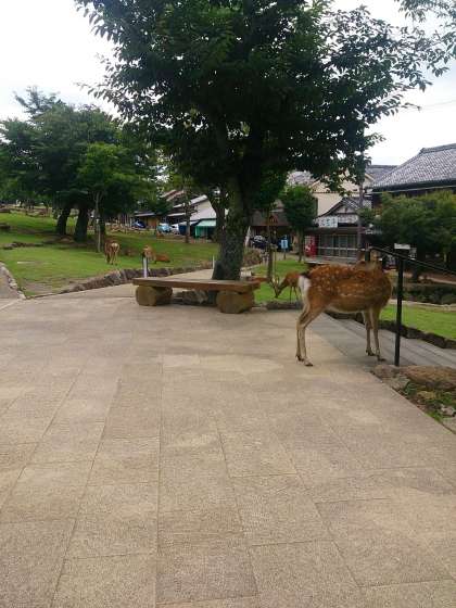 晴天の中、若草山で昼食です。みんなテンションが上がり楽しそうでした。が、そこに鹿さんが…。みんなのおいしそうなお弁当を目指してやってきて、何人かの子たちのお弁当をねらっていました。