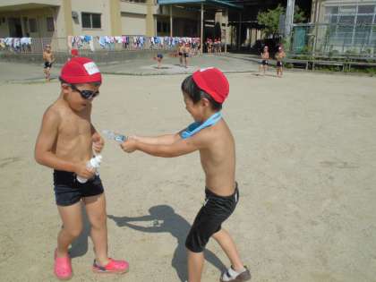 プールに入る前に、生活科の「なつだ、とびだそう」の学習をしました。マヨネーズなどの容器に水を入れて、運動場で楽しく水かけっこや水とばしをしました。その後、シャワーにかかり、水遊びをして楽しく学習しました。