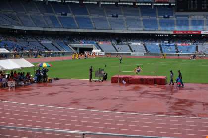 京都は快晴の猛暑日でしたが,横浜は台風の影響もあり,雨が降ったり止んだりの天候となりました。幸い競技時間は雨に降られることもなく,全国大会で自己ベストの1m35cmを跳び,5位に入賞しました。