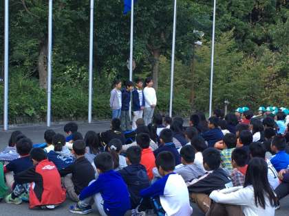桂東小だけの朝のつどい後に,桂東小,洛央小,向島小,稲荷小で4校合同朝のつどいを行ないました。
