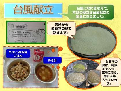 今日の献立は,台風12号にそなえて献立が「台風献立」に変更になりました。
