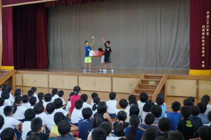 桂東小学校では,運動会の組の色を児童朝会で全校児童が見守る中,応援団長による公開抽選により決めています。