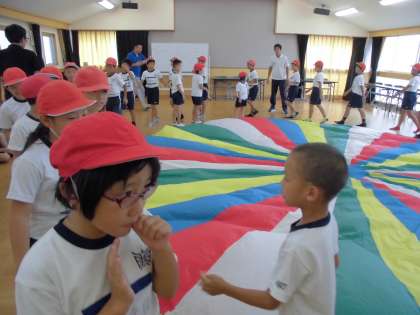 今年の運動会では,5年生が5組のみんなと一緒にバルーンを使った演技に挑戦します。5年生は,初めてバルーンを見るという人も多く,バルーンのきれいな動きに,驚きと楽しさを感じていました。