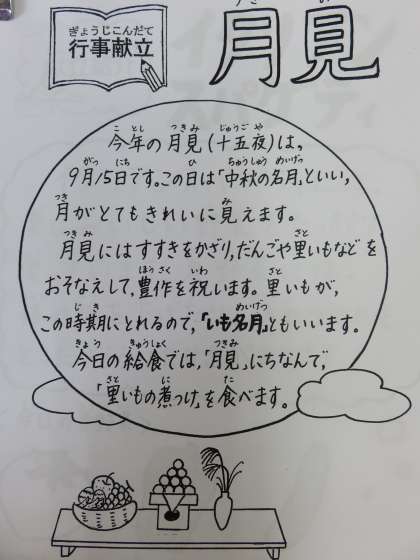 子どもたちからは,「お月さまの中にうさぎさんがいる」「月見だんごを食べる」などとお月見に関する話題がいくつか出てきました。