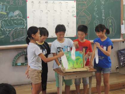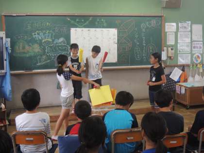 山の家を終えて,心に残ったことをグループごとに劇や紙芝居にして再現し,学んだことやこれからの自分に生かしたいことを発表しました。各グループ,協力して準備や練習をし,本番では,生き生きと発表することができました。
