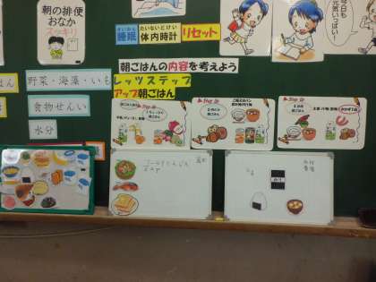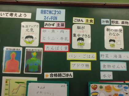 9月の食育授業は,「朝ごはんについて考えよう」のテーマで5,6年生にしています。夏休み明けの生活リズムを見直す事や運動会にむけての体調管理に朝ごはんはとても大切です。授業当日の朝ごはんを書き出すと「食べてきていない」「パンだけ」「ごはんとお茶」の子どもも何人かいました。朝ごはんには,体や脳を目覚めさせる3つのはたらき(スイッチ)があることを学び,自分の朝ごはんをどう改善させたらよいかを考えました。「朝ごはんがこんなに大事なものだとは思っていなかった」「パンだとおかずがないから,ごはんにしよう」「脳や記憶することに朝ごはんが関係しているなら,明日から1品増やそう」などの感想がありました。朝ごはんの内容については,ご家庭の協力が必要です。今,桂東小学校の子どもたちは,運動会の練習を毎日頑張っています!どのご家庭でも,是非,朝ごはんのステップアップをする機会にしていただければと思います。